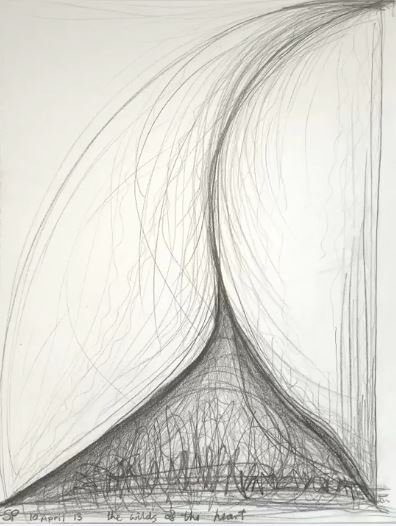 I love that creating an image can be an adventure. I often start and have no plan for how it’s going to go. Like in this image (to the left), a pencil drawing where I just started with the curved line that felt right and drew the next curve and kept adding even the squiggles down the bottom. I don’t know if it means much but it felt good.